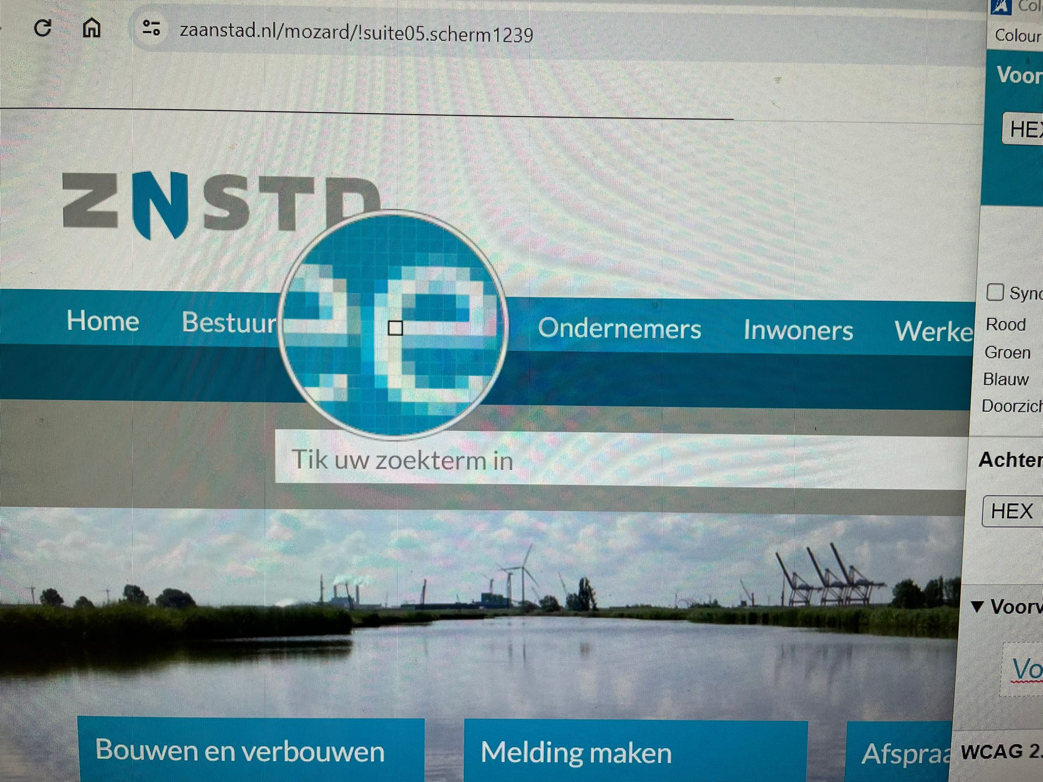 In dit voorbeeld van de gemeente Zaanstad (puur als voorbeeld omdat ik daar zelf woon), zie je dat het bij de kleinere lettertypes niet goed gaat qua contrast. Dus de hele kleine witte letters op de lichtblauwe achtergrond geeft onvoldoende contrast.